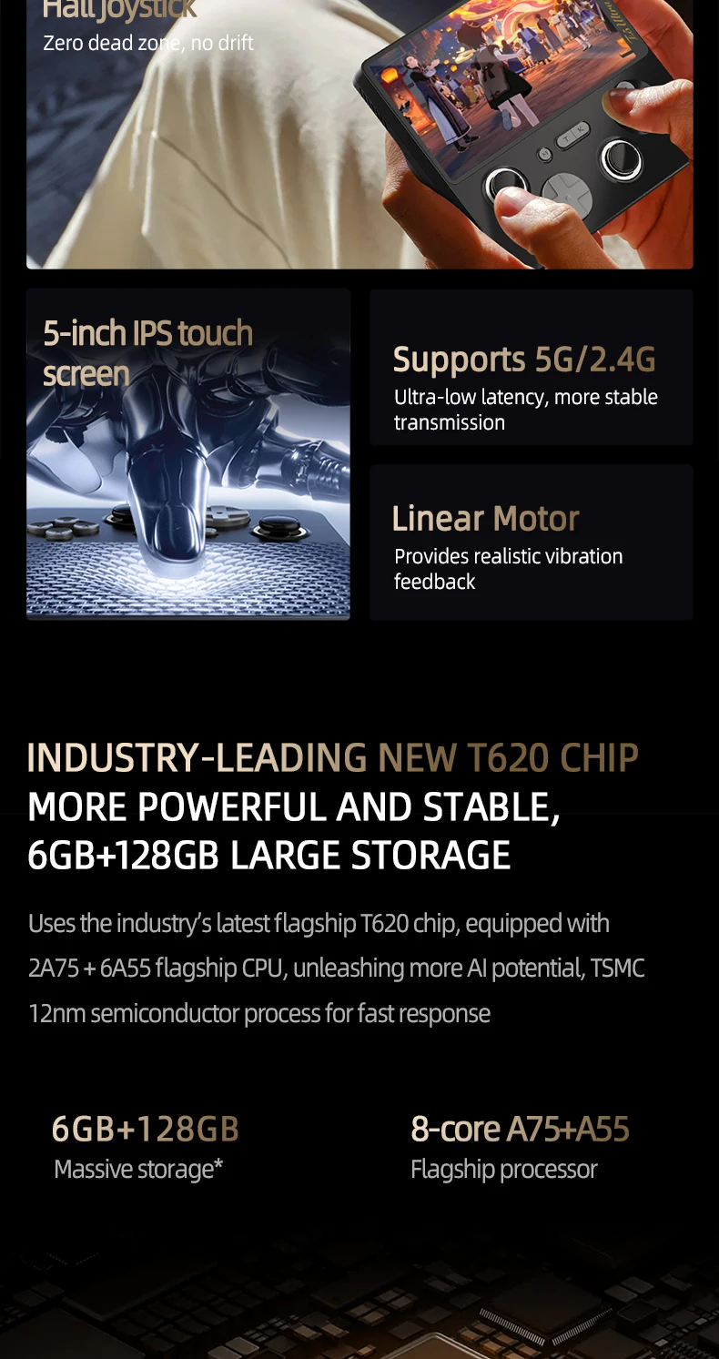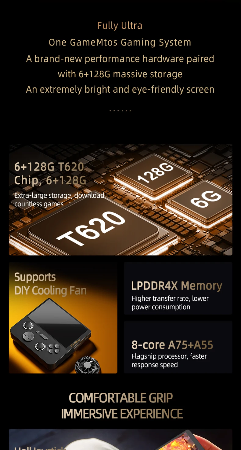 Krachtige hardware voor z’n formaat: Onder de motorkap draait een moderne Unisoc T620‑chip met 8‑core CPU + Mali‑GPU — gecombineerd met 6 GB RAM en 128 GB opslag. Daarmee is de E5 Ultra geschikt voor emulatie van klassieke consoles Ă©n heuse retro‑bibliotheken.Â